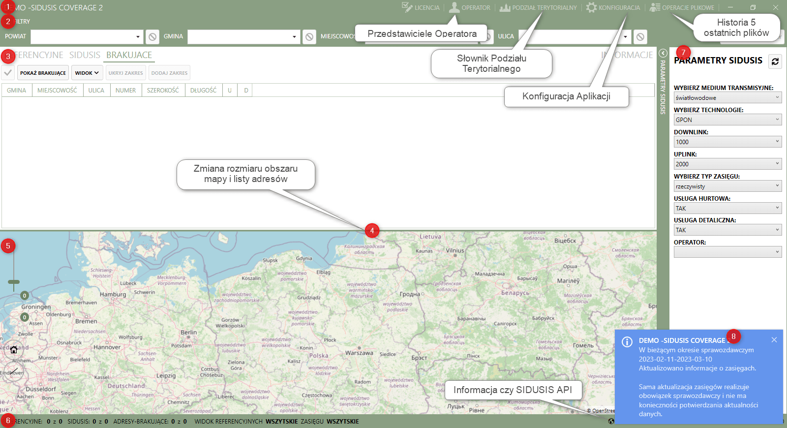 Aplikacja Sidusis Coverage powstała na potrzebę szybkiego porównania posiadanych już adresów zasięgu sieci z bazą adresów referencyjnych udostępnianych przez serwis SIDUSIS oraz aktualizację tych adresów parametrami sieci i eksportu tych danych do pliku csv zgodnego ze strukturą pliku przyjmowanego przez serwis SIDUSIS. Obecna wersja aplikacji jest rozwinięciem poprzedniej idei o możliwość osadzonej w niej mapy umożliwiającej zaznaczanie punktów adresowych jak również identyfikację czy jest to adres brakujący, czyli poza zasięgiem w stosunku do już określonych adresów jako będących w zasięgu sieci.