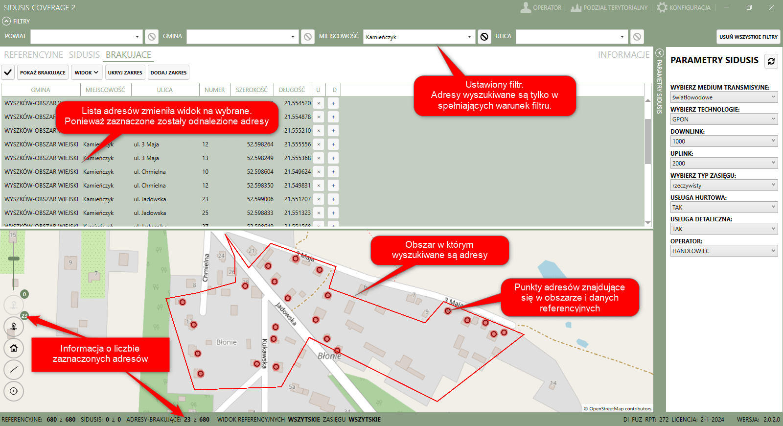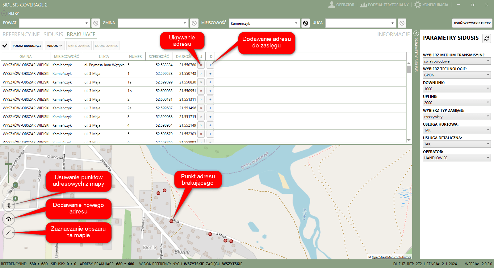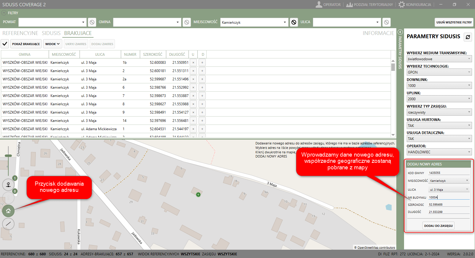 Adresy brakujące są różnicą pomiędzy adresami referencyjnymi a zdefiniowanymi już adresami zasięgu sieci SIDUSIS, jeżeli chcemy dodać adresy do listy adresów zasięgu sieci w pierwszej kolejności należy ustawić parametry SIDUSIS w panelu po prawej stronie które zostaną przypisane dodawanym adresom. Parametry domyślnie ustawione są na wartości ustawione w konfiguracji.