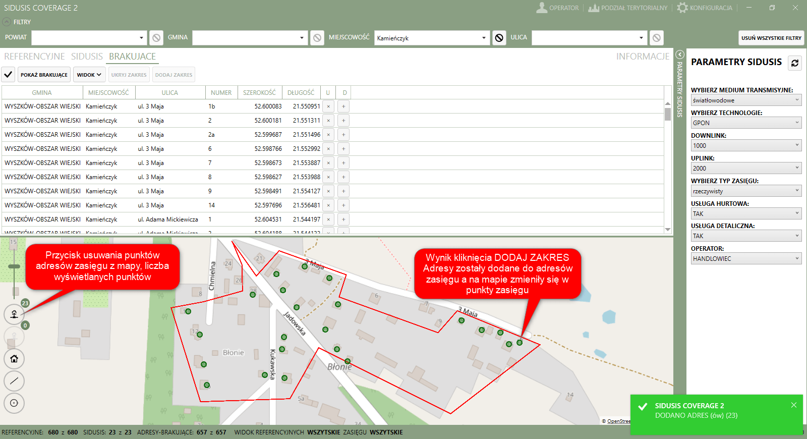W wyniku działania tego przycisku wyświetlane zostają punkty brakujących adresów oznaczone kolorem czerwonym oraz na liście zaznaczone są adresy odnalezione w tym obszarze, jeżeli mamy zdefiniowane prawidłowo parametry SIDUSIS wystarczy kliknąć przycisk Dodaj zakres, aby znaleziony adres(y) dodać do adresów zasięgu SIDUSIS. Po dodaniu adresów do adresów zasięgu sieci nasze punkty zmienią kolor na zielony, czyli że są adresami dodanymi do zasięgów sieci.