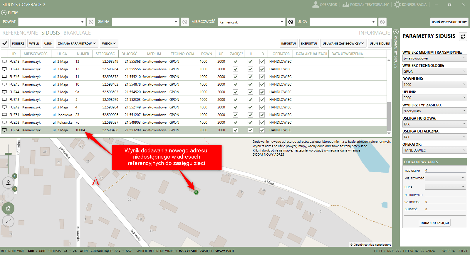 Po kliknięciu tego przycisku kursor myszki zmienia się ikonkę rączki która umożliwia wskazanie punktu na mapie z którego zostaną pobrane współrzędne i umieszczone w nowo wyświetlonym panelu pod parametrami SIDUSI, Dodaj nowy adres w którym definiujemy parametry nowego adresu kliknięcie na mapie uzupełnia długość i szerokość geograficzną w tym panelu pozostaje nam tylko w polu wyboru miejscowość wybrać odpowiednią miejscowość dostępną w słowniku podziału terytorialnego oraz wybrać odpowiednią ulicę z listy ulic dostępnych w słowniku podziału terytorialnego oraz wprowadzić numer budynku. Po wprowadzeniu wymaganych danych adresu przyciskiem Dodaj do zasięgu dodajemy ten adres wraz z parametrami SIDUSIS do adresów zasięgu sieci SIDISIS. Poniższy ekran przedstawia wynik tej operacji.