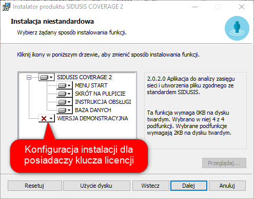 Instalacja w wersji pełnej nie instaluje klucza aktywacyjnego, który dostarczany jest po zakupie licencji, dlatego w instalatorze opcja WERSJA DEMONSTRACYJNA powinna być oznaczona jako „Cała funkcja będzie niedostępna” jak na poniższym ekranie: