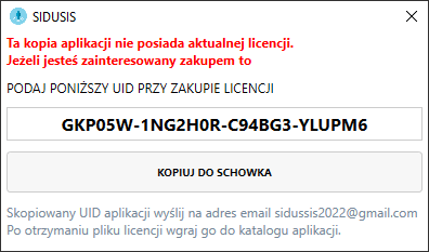 Po uruchomieniu aplikacji bez klucza licencji aplikacja wyświetli ekran z wygenerowanym UID aplikacji, należy go skopiować i przesłać na adres email sidusis2022@gmail.com, oraz dane do faktury: