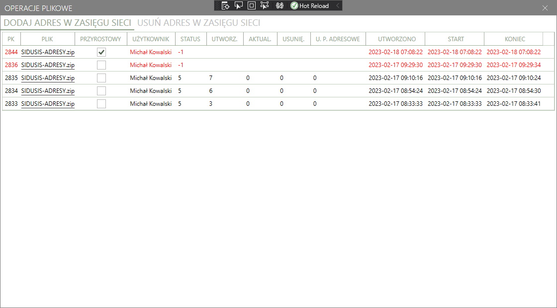 Jeżeli chcemy przekazać plik adresów zasięgu do usunięcia wybieramy przycisk PRZEKAŻ DO USUNIECIA, wynik operacji usunięcia adresów zasięgu z serwisu Sidusis z pośrednictwem SIDUSIS API możemy sprawdzić w oknie OPERACJE PLIKOWE: