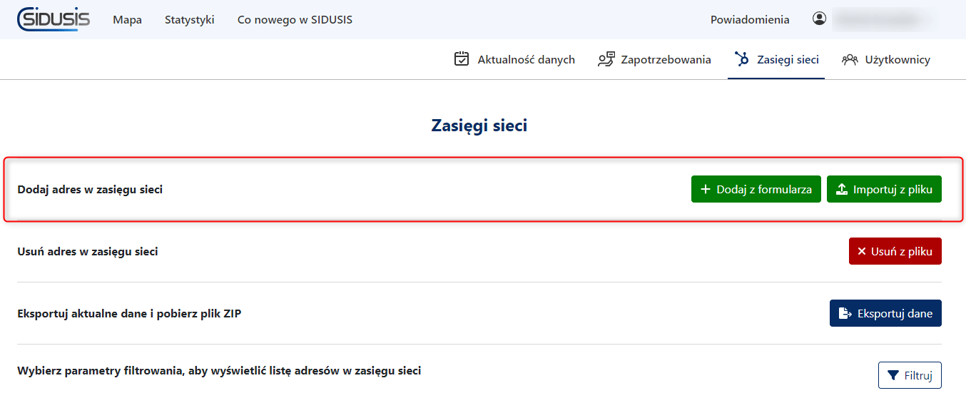 Przycisk eksportuj umożliwia zapisanie zdefiniowanych w aplikacji adresów zasięgu sieci do pliku csv zgodnego ze strukturą opisaną w dokumencie standardy technologiczne. Po zapisaniu pliku, następuje kompresja pliku csv adresów zasięgu. Następnie możemy wskazać skompresowany plik w serwisie SIDUSIS wykorzystując do tego odpowiednią opcję: