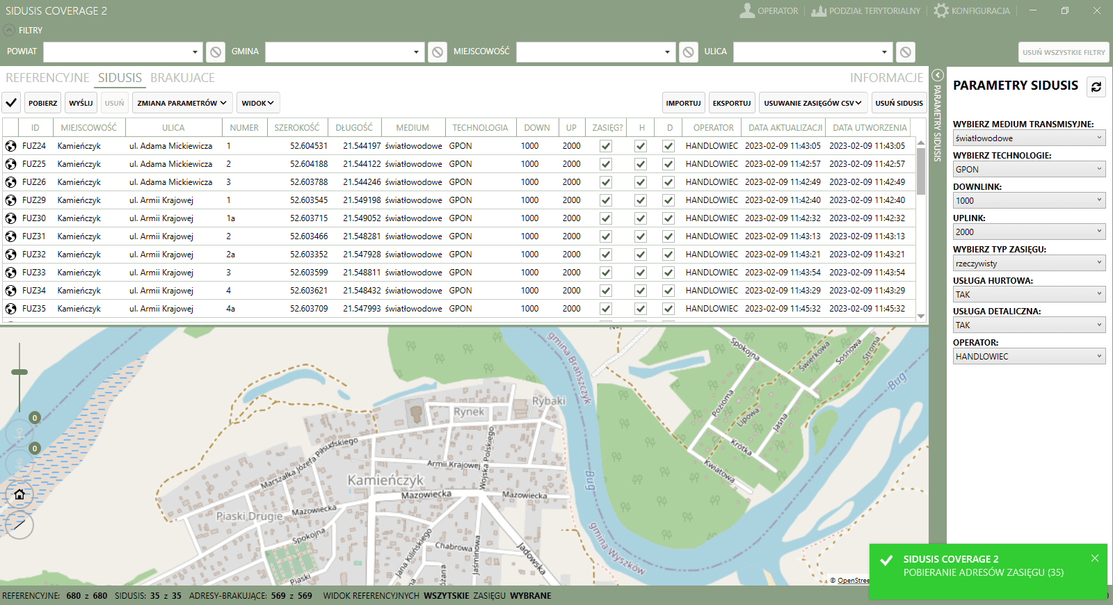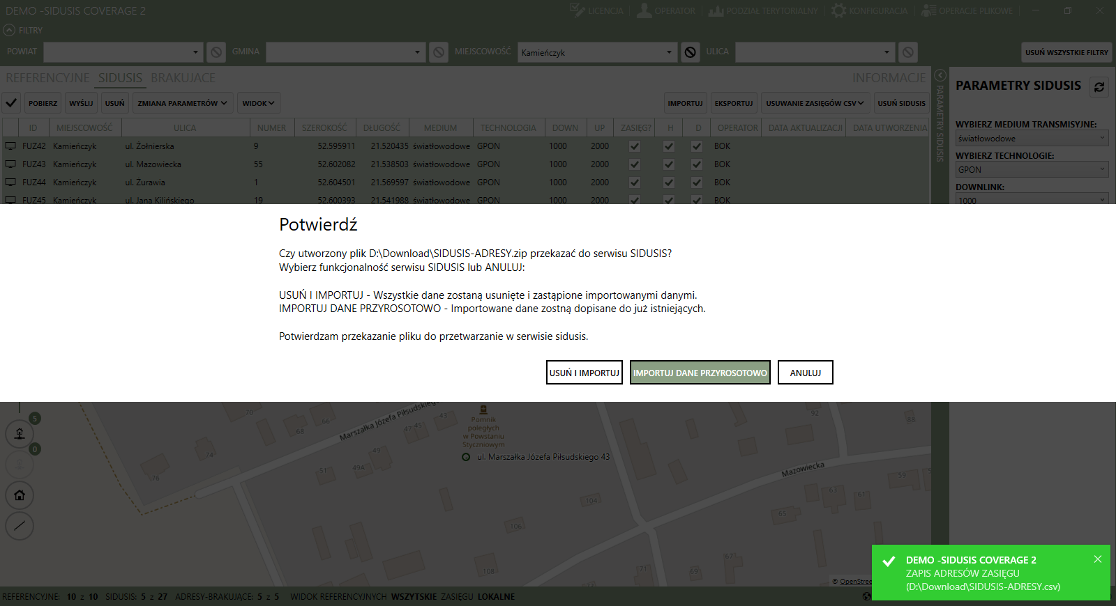Po kliknięciu przycisku POBIERZ, jeżeli używamy SIDUSIS API wywoływana jest komunikacja z serwisem SIDUSIS i pobierane są do aplikacji adresy zasięgu znajdujące się w serwisie.