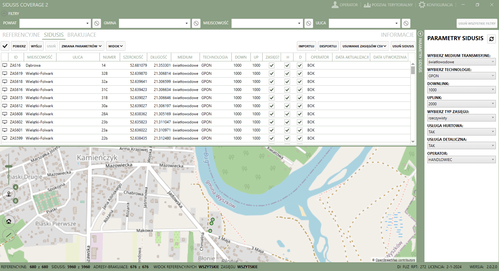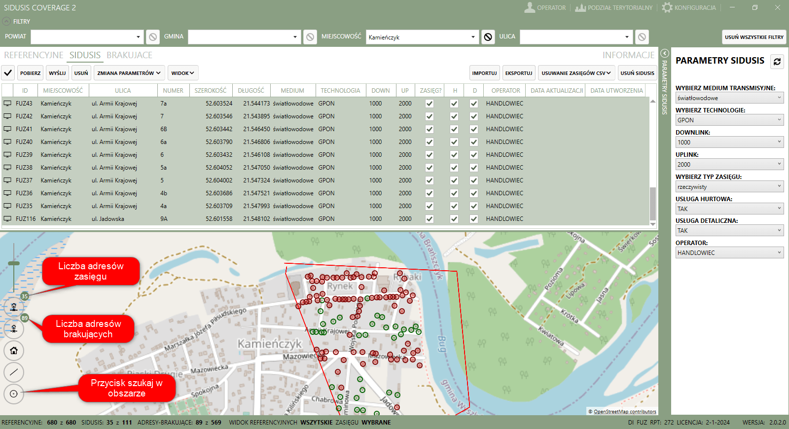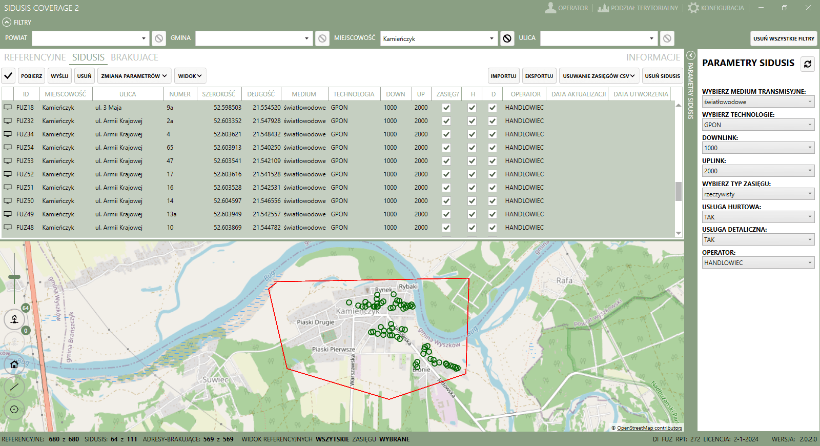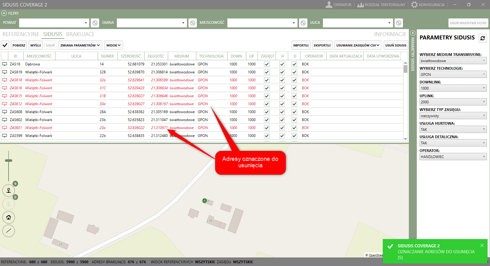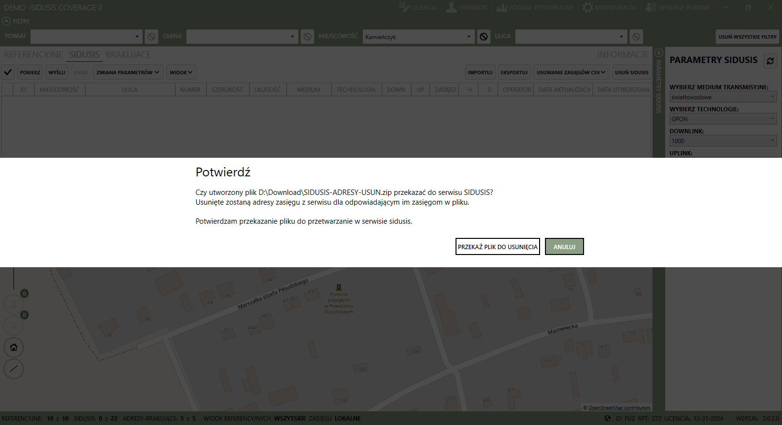 - Usuwanie adresów zasięgu co skutkuje pojawieniem się ich ponownie w zakładce adresy brakujące, jeżeli używamy SIDUSIS API adresy zostaną również usunięte z serwisu SIDUSIS,