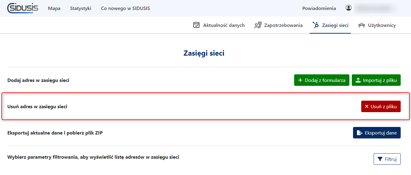 - Usuwanie zasięgów csv, jest to nowa funkcjonalność wprowadzona w serwisie SIDUSIS umożliwiająca usunięcie zakresu adresów za pośrednictwem pliku csv który wczytujemy w odpowiednim miejscu w serwisie SIDUSIS,