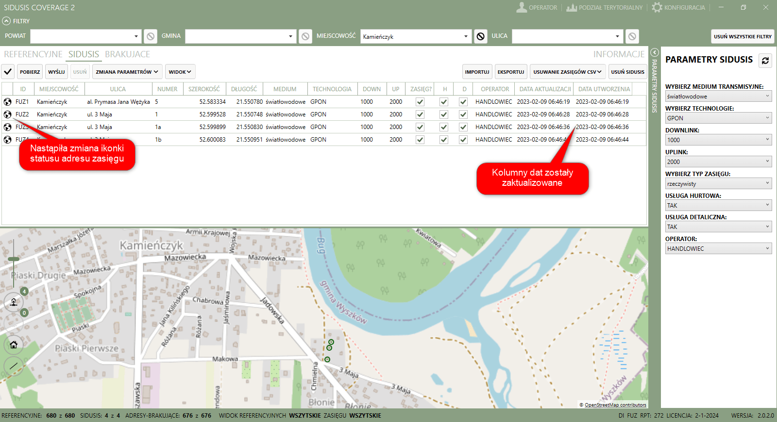 - w statusie online - wyświetla adresy zasięgu wysłane do serwisu SIDUSIS, o ile zostały przesłane za pomocą funkcji wyślij lub pobrane z serwisu SIDUSIS za pośrednictwem przycisku POBIERZ, ikonka globusa informuje, że adres był w serwisie SIDUSIS, dodatkowo w kolumnach daty utworzenia i aktualizacji pojawiają się wartości pobrane z serwisu SIDUSIS,